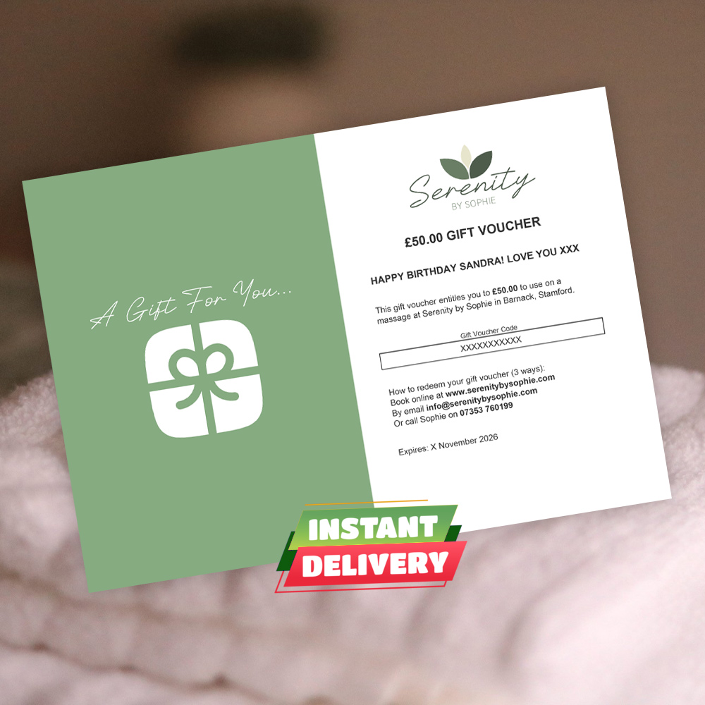 Delivered by email instantly, pre-set to a specific massage (mini, back/neck, full-body, or extended). The gift of calm, ready to redeem.